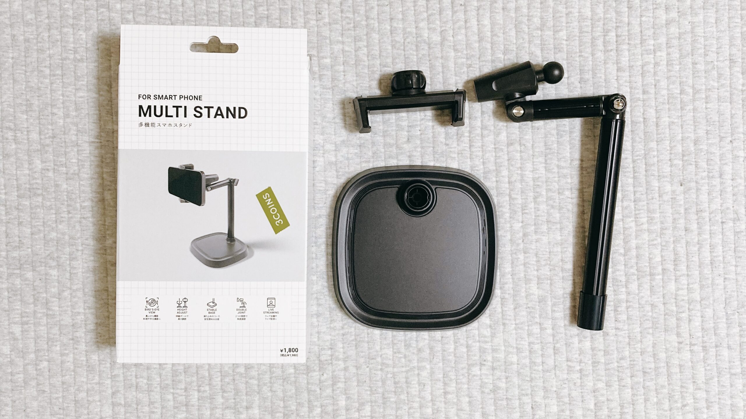 それを解決したくて買ったのが、スリーコインズの「多機能スマホスタンド」です。
